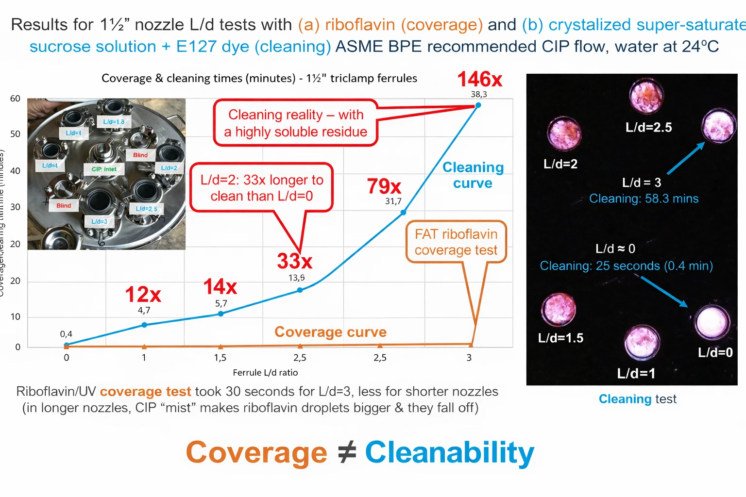 Figura 1. Comparación entre ensayo de cobertura con riboflavina y ensayo de limpieza con residuo soluble en función de la relación L/d. El incremento del tiempo de limpieza es exponencial a medida que aumenta el dead leg.