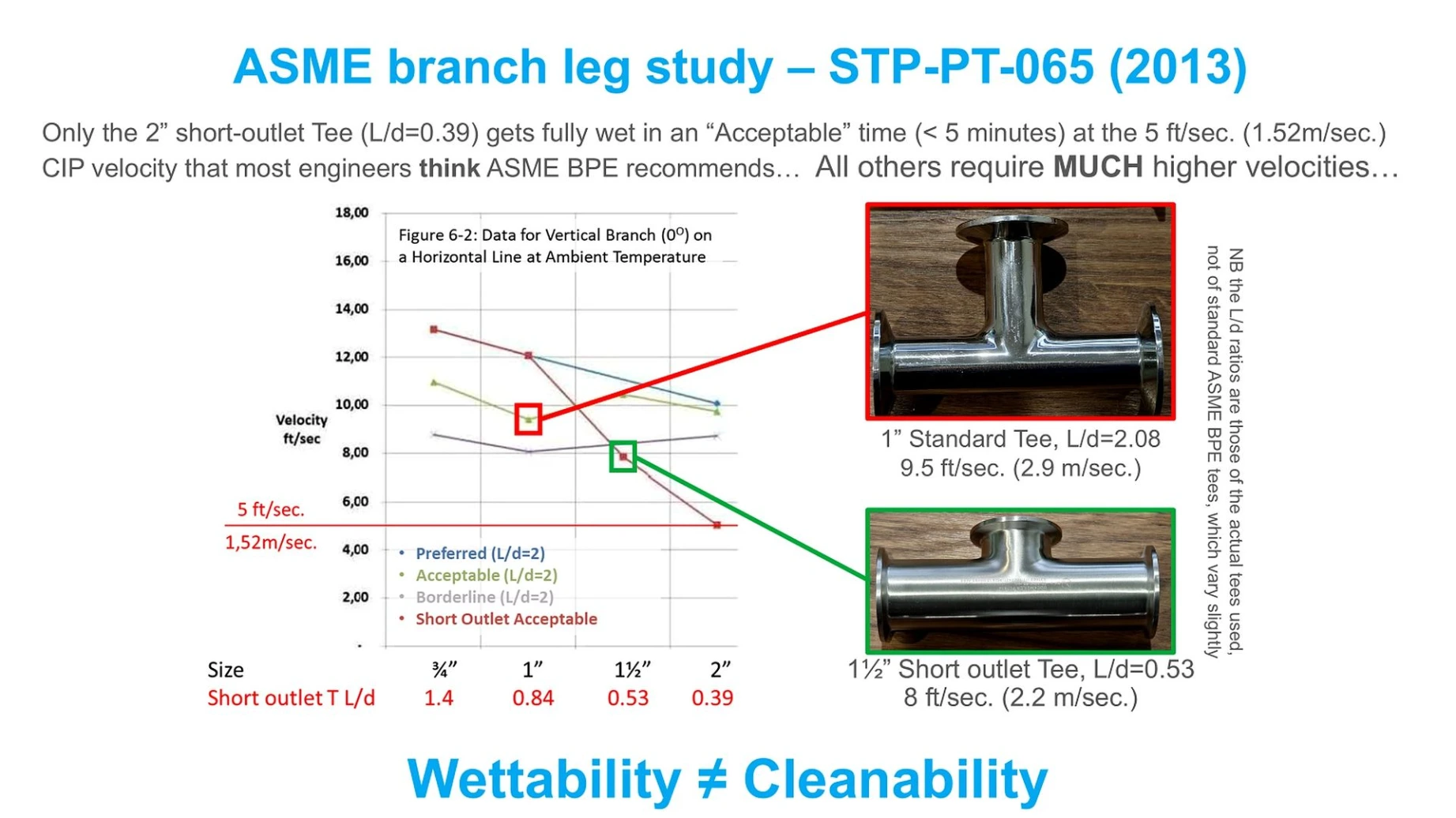El estudio concluye que son necesarias velocidades CIP considerablemente superiores a los comúnmente citados 5 ft/s (1,52 m/s) para eliminar completamente el aire de los branch legs en un tiempo: