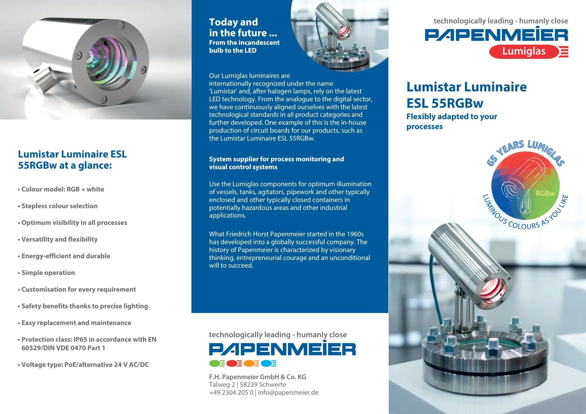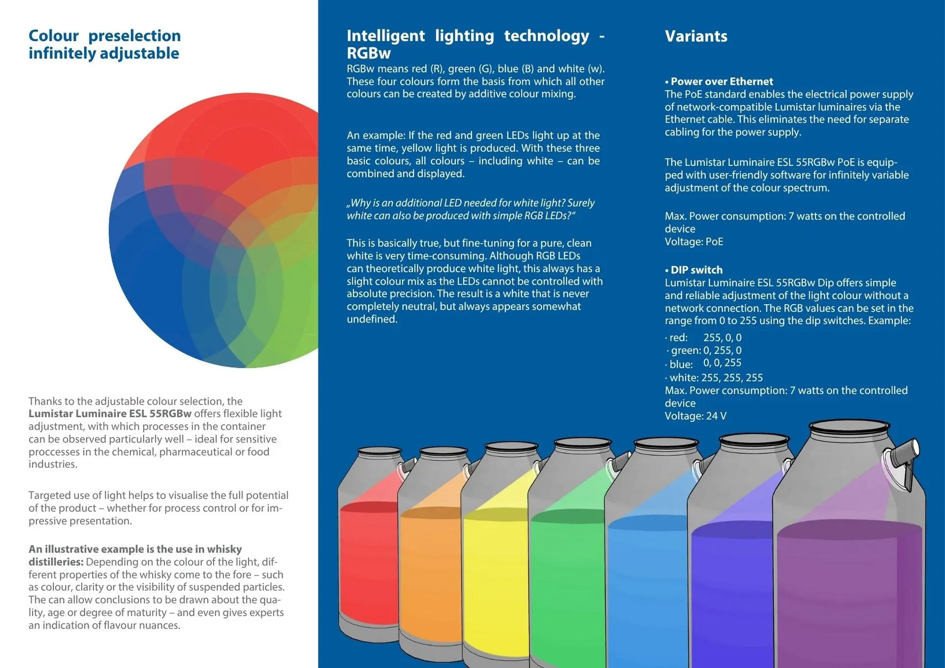 Gracias a su selección de colores regulable, la luminaria Lumistar ESL 55RGBw permite un ajuste flexible de la luz, facilitando una observación óptima de los procesos dentro del recipiente. Esto resulta especialmente útil para procesos delicados en la industria química, farmacéutica y alimentaria.